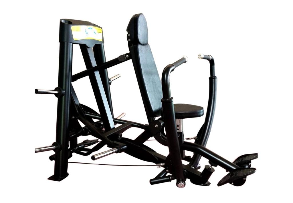 La Máquina Prensa de Pecho Declinado H-LINE trabaja los músculos pectorales. Se trata de una máquina en la que es difícil perder carga. El asiento y el respaldo se mueven empujando la barra, lo que evita el dolor de hombros y estimula los músculos objetivo ¡incluso para principiantes en entrenamiento!