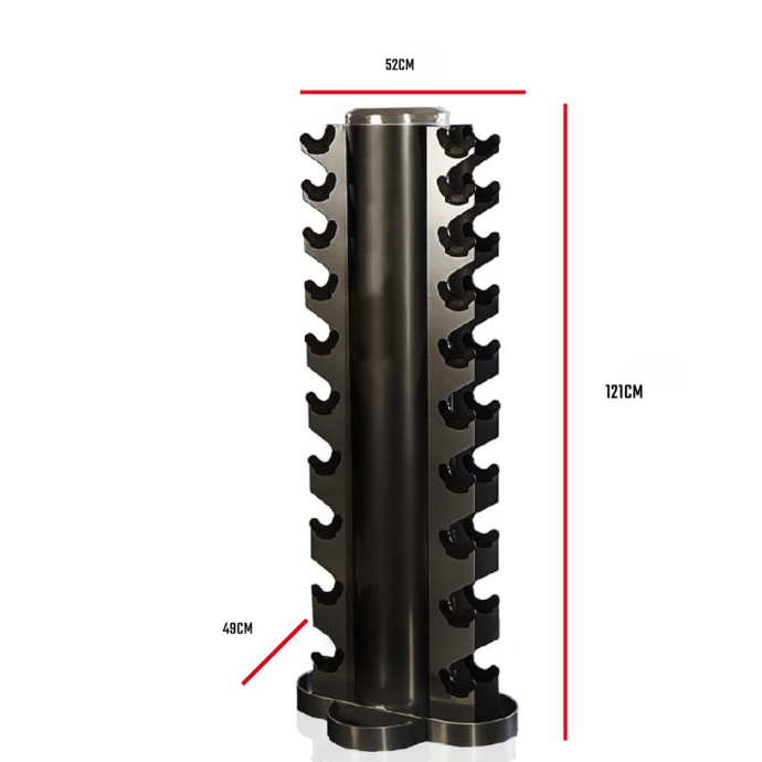 Capacidad de Almacenamiento: Este mancuernero cuenta con espacio para 10 pares de mancuernas, permitiendo mantener tu equipo ordenado y al alcance de la mano durante tus rutinas.