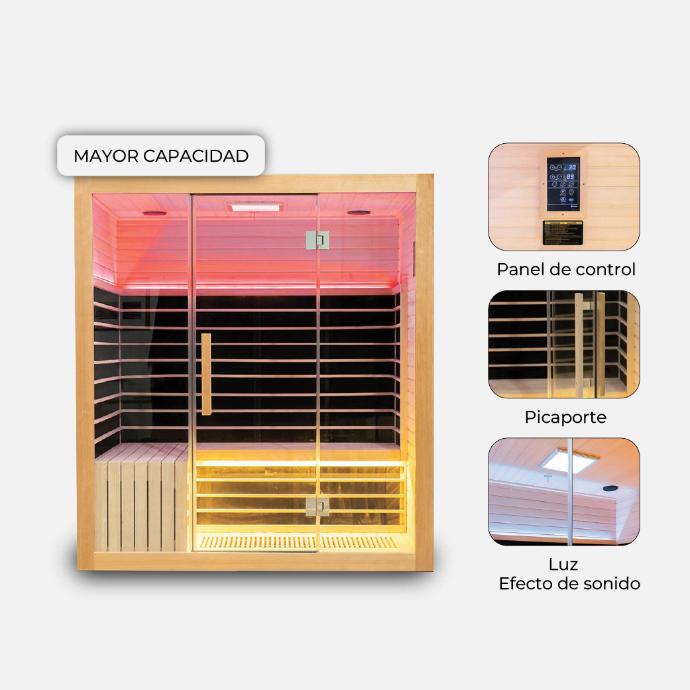 Perfecto para uso residencial o en spas, esta sauna ofrece un ambiente acogedor, tecnología de vanguardia y una experiencia de relajación inigualable.